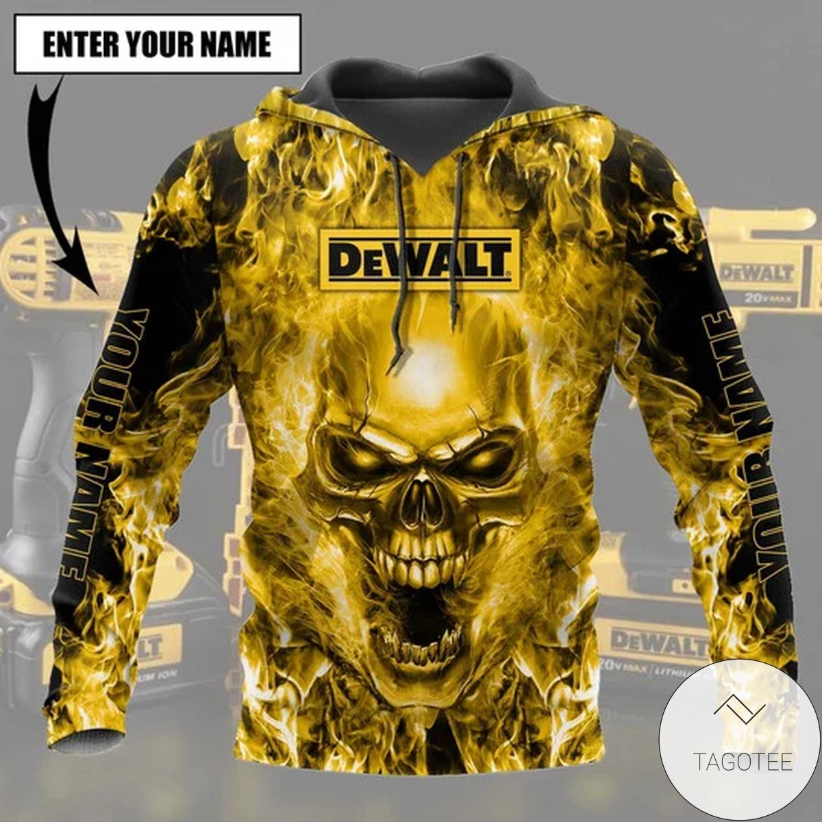Personalized Dewalt Beautiful Tools Yellow Fire Flame Skull Hoodie